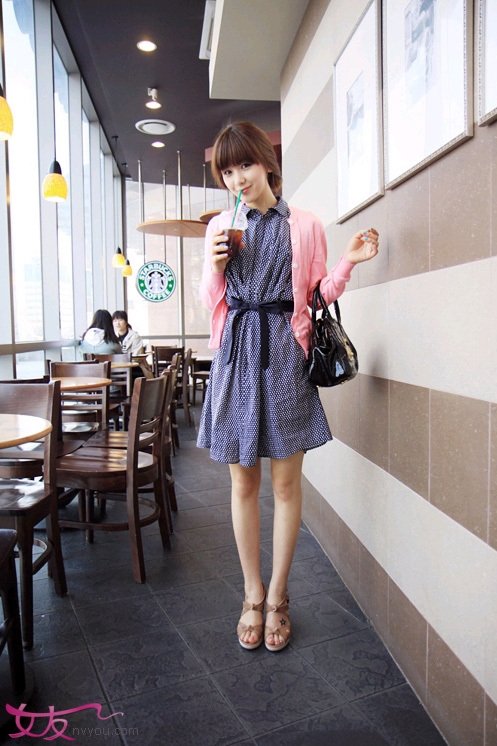 无袖衬衫裙搭配粉色针织衫让你更加亮眼