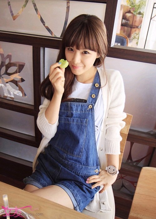 背带牛仔穿起来甜美又可爱,MM的笑容也很迷人